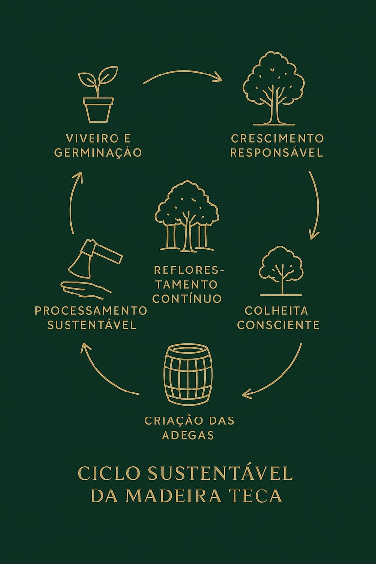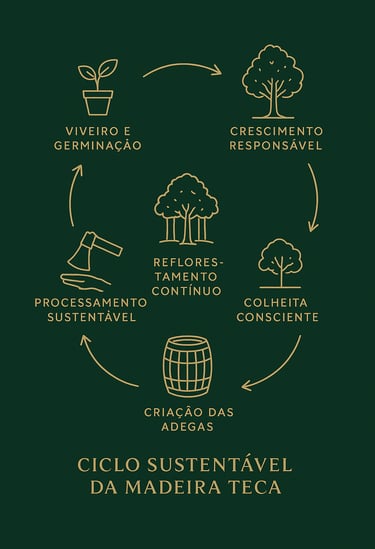 Trabalhamos principalmente com madeira teca sustentável, reconhecida mundialmente pela sua resistência natural, durabilidade e beleza única. A teca é ideal para ambientes de conservação de vinhos, pois mantém estabilidade frente à umidade e variações climáticas, garantindo a longevidade da adega. Além disso, utilizamos ferragens de alta qualidade, acabamentos nobres e detalhes artesanais que conferem sofisticação e exclusividade a cada peça. Todo o processo é pautado pela responsabilidade ambiental, assegurando que cada adega seja não apenas funcional e elegante, mas também um reflexo de práticas sustentáveis.